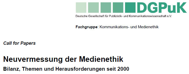 Die DGPuK-Fachgruppe Kommunikations- und Medienethik und das Netzwerk Medienethik laden Interessierte aus Wissenschaft und Praxis mit einem Call for Papers herzlich ein, sich an unserer Jahrestagung (Do 14. – Fr 15. Februar 2013 in München) zu beteiligen.